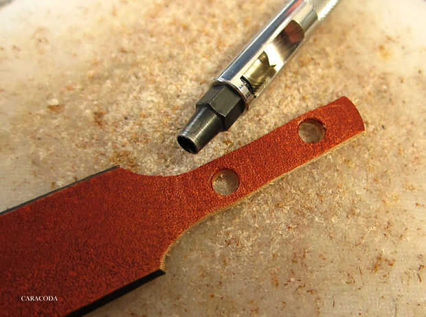 Instale un remache (en cada extremo). Remaches se suponen no hacer nada, son sólo decoración. Marque los orificios costuras a ambos lados de los remaches.