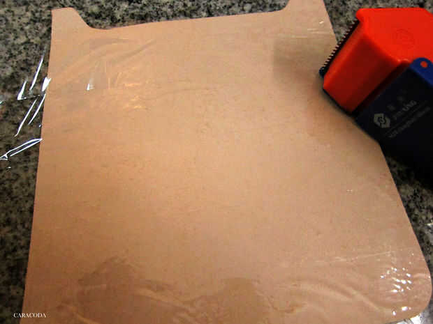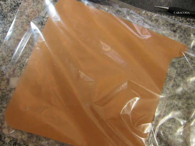 Ahora obtendremos el cuero para herramientas. Primero necesitamos el cuero del caso. Cubierta significa aplicar suficiente humedad para que el cuero da buen color bruñido cuando herramientas. A fin de sumergir la pieza de cuero (que vas a tallar, no todas las piezas de la bolsa) en agua limpia a temperatura ambiente. No sostener bajo el agua pero quitar enseguida. Sólo la inmersión y sacar, nada más. Ahora, ponerlo dentro de una bolsa de plástico limpia, no selle la bolsa. Déjelo por 10-15min dejar que la humedad penetre la piel. Luego retire la piel de la bolsa y lo dejas hacia arriba sobre la mesa a la temperatura ambiente. Dejar durante 30 minutos o más hasta que veas que el color original del cuero está regresando. Podría tomar más de 30 min dependiendo de la temperatura, espesor del cuero y en cuánto tiempo llevó a cabo en el agua. Una vez que vemos que la superficie de la piel está suave y seco pero frío al tacto - está listo para tallar. Un Consejo: tomar un celo (la más amplia se puede encontrar) y pegarlo en la parte posterior del cuero - evitará cuero estiramiento y distorsión durante el sellado. También se puede utilizar en contacto con papel (trazadores de líneas de drenaje) - utilizar el más barato.
