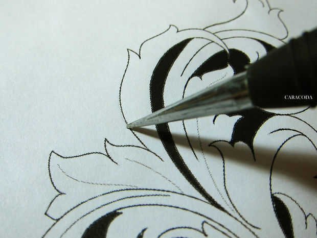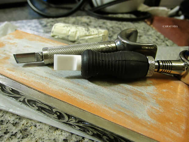Ahora toma un cuchillo del eslabón giratorio. Es mejor tener dos hojas - una más amplia para líneas más largas y hoja detalle angular para líneas pequeñas y curvas. La hoja debe ser muy fuerte, piedra de afilar a menudo durante el proceso. Prefiero empezar con poco y líneas curvas y luego paso a los más, pero usted pueden hacer lo que te gusta.