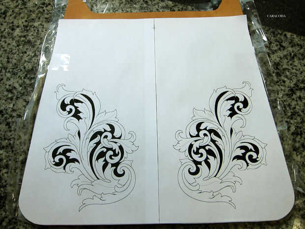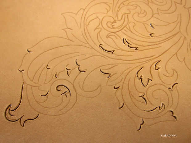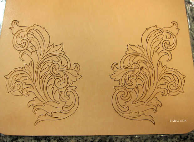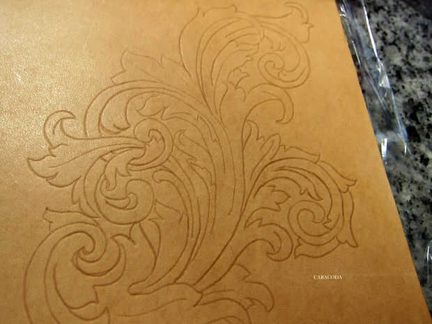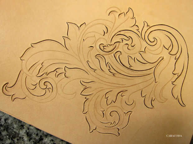 Cuando el cuero se seque en la superficie y fría al tacto (que indica que todavía hay humedad en el interior) podemos empezar a trazar nuestro diseño de herramientas. Coloca el papel con el diseño (puede usar minas o puedes dibujar tu propio) en el cuero y traza todas líneas con un lápiz. No presione a duro o se rasgue el papel. Ligera presión dará suficiente color en cuero para las líneas de ser visto.