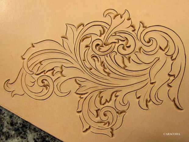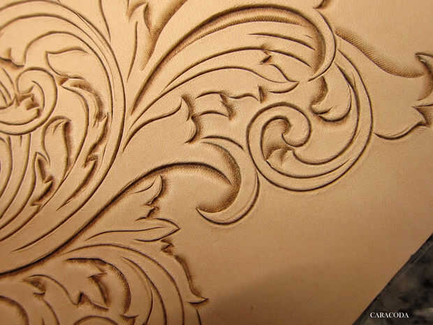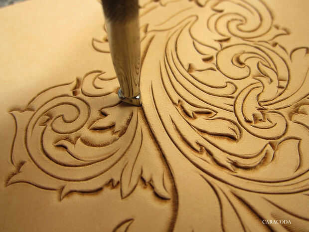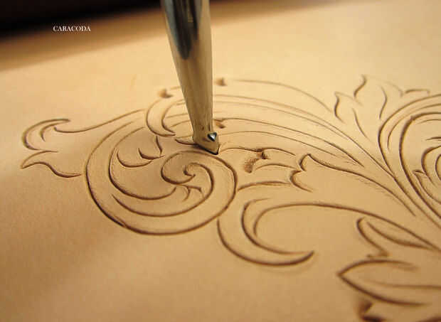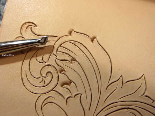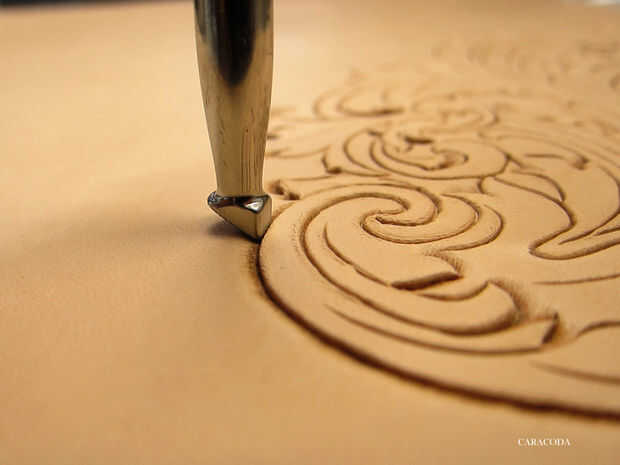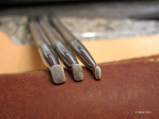 Ahora uso a Biseladoras, preferiblemente de diferentes tamaños. Usted necesitará las pequeñas para lugares pequeños y más amplia para líneas más largas y más rectas. Otra vez, generalmente comienzan con líneas cortas y moverse a los largo. Utilice un mazo con un cómodo para el peso de su mano. Su brazo no debe cansarse y siento como que se cae. "A pie" el sello a lo largo de la línea constantemente golpear (ligeramente) con el mazo. Tratar de lograr una suave línea incluso. Aplique presión uniforme a lo largo de todas las líneas. Usar cuadros de Biseladoras, pero lisa son buenos, también. Ver el diseño, qué líneas están en la parte superior y que están debajo de ellos. Constantemente se refieren al patrón en papel para ver dónde está el fondo y no a perderse en las líneas.