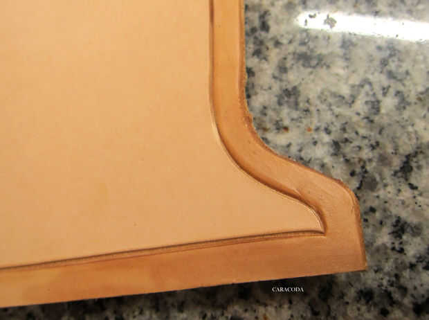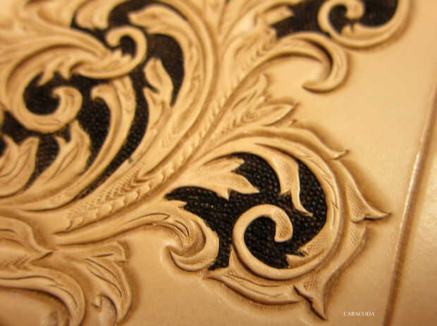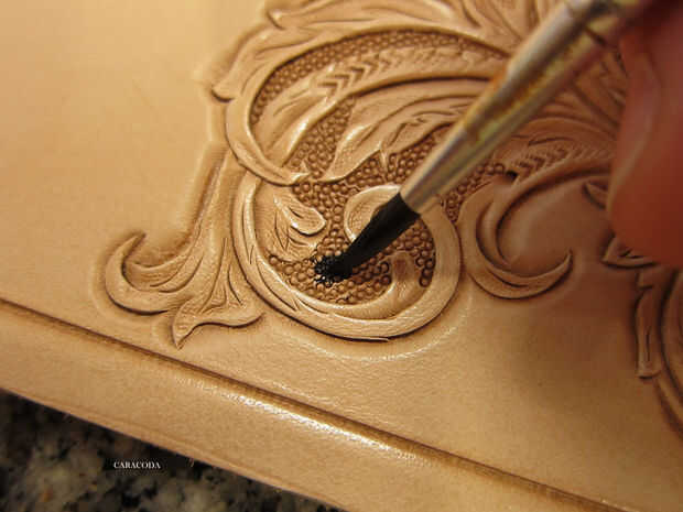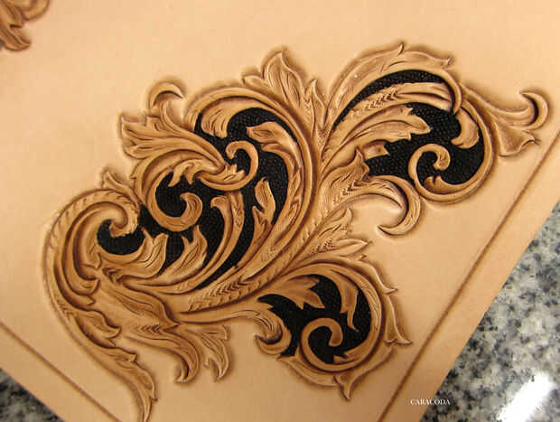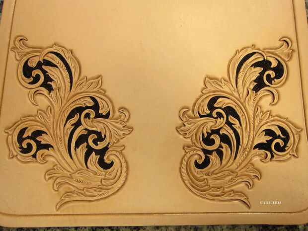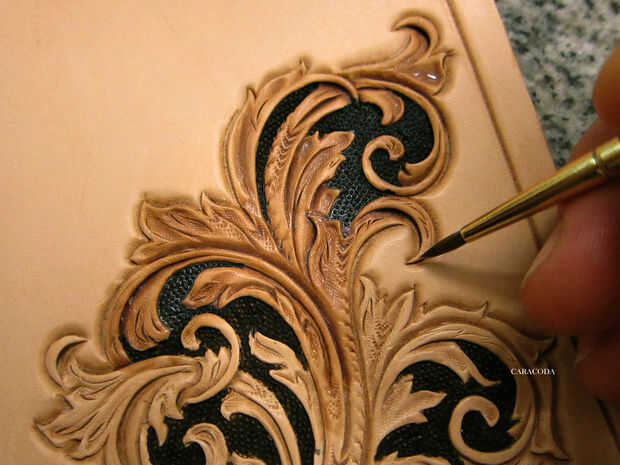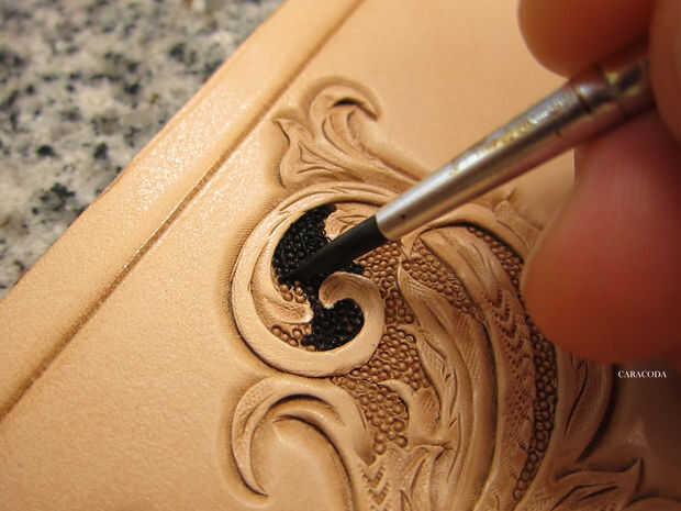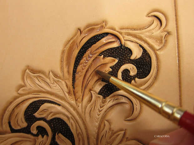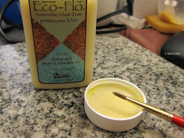 Ahora uso resistir final. He usado Eco-Flo Block Out pero Super Shene u otro final hará el trabajo. También limpia el cepillo pequeño resistir se aplica a las hojas se desplaza y tenga cuidado de no conseguir en cuero en el diseño. Incluso una pequeña gota evitará antiguo para pegarse al cuero y dejará una luz spot.