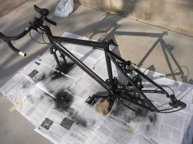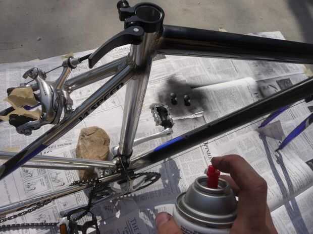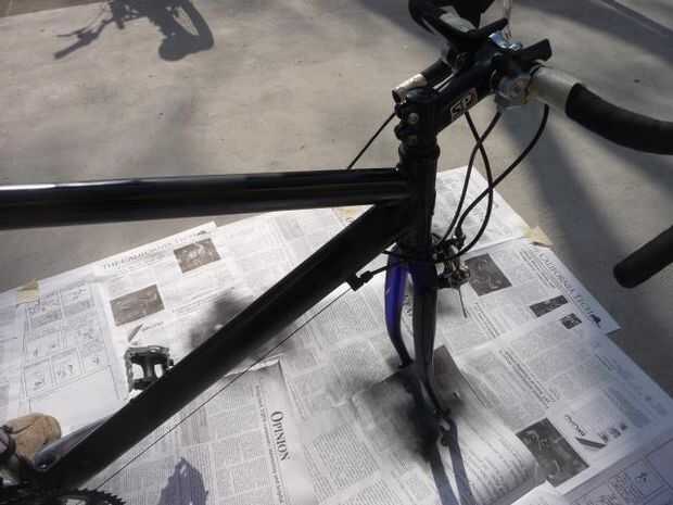 Quiere pintar la moto entera negro plano. Grande, incluso trazos y uso spray el uno-marco, la horquilla delantera y el cuadro posterior. Asegúrese de tener la parte inferior del marco se echará sólo aerosol pintura del lado este punto. Un Consejo práctico es colocar cinta adhesiva sobre la superficie de contacto de las zapatas de freno. Esto evita que cualquier pintura interfiriendo con su frenado al primero que volver a montar la bicicleta.