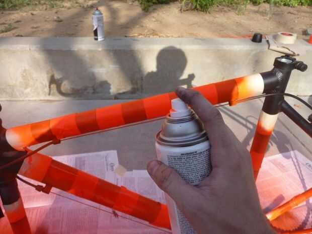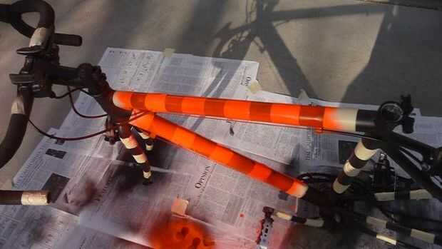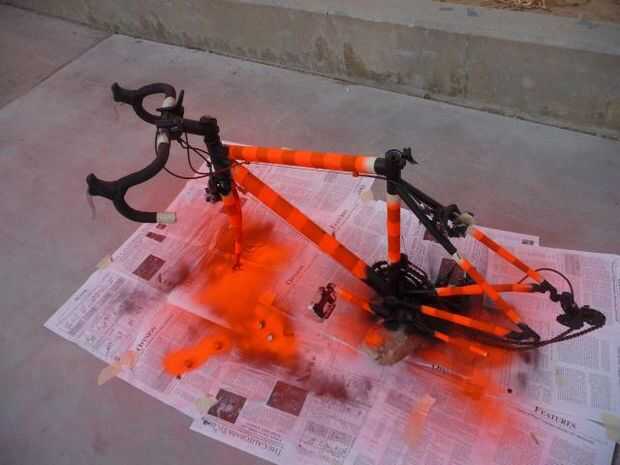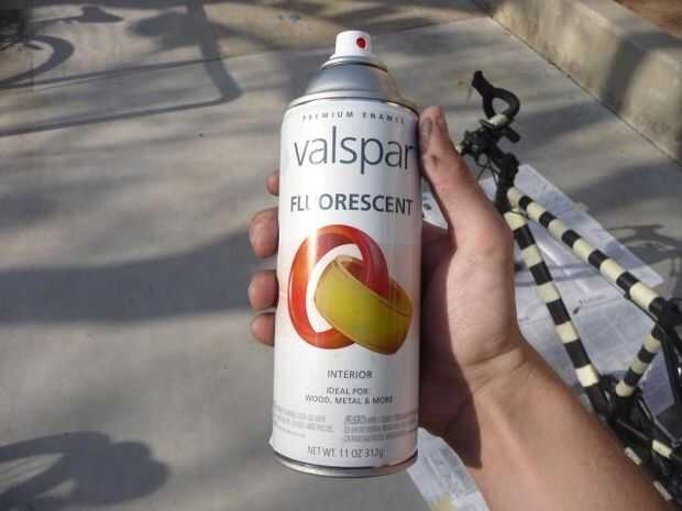 Funcionará cualquier pintura fluorescente brillante. Elegí naranja. Del aerosol entre la cinta de enmascarar para pintar las rayas. Toma algún trabajo a no más de esterilización y desordenar el contraste. Puede utilizar la pintura negra una segunda vez para realizar algún trabajo de reparación.
