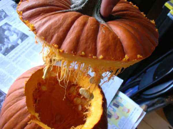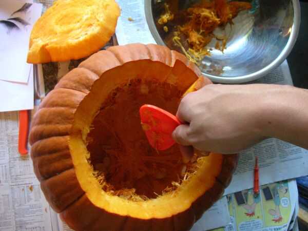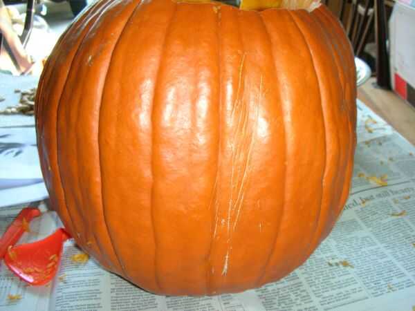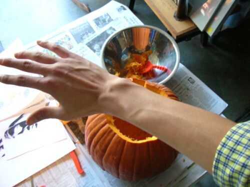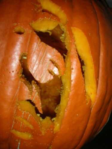 Tallar la Jack-o-LanternCortar más grande que normal agujero en la parte superior y dos pequeños agujeros en la parte inferior de la calabazaInserte el niño en la bolsa de plástico (al horror de los espectadores)Lugar niño en calabaza, smilling locam
