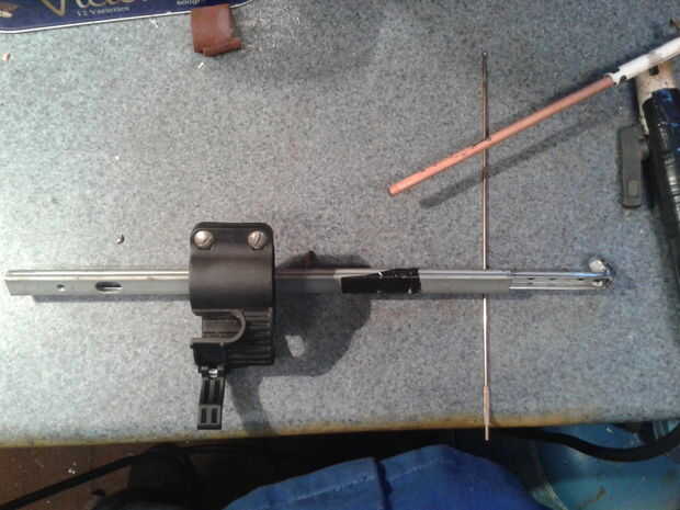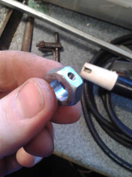 Para sujetar la varilla en su lugar perforé una tuerca de 17mm AF para el tamaño de mi barra de tubo I Cruz lo perforó y a través del tubo y el agujero lateral en la tuerca M4 y clearenced el agujero en el tubo de rosca y M4 un poco perno doblado a 90 grados se usa para bloquear la varilla en su lugar.