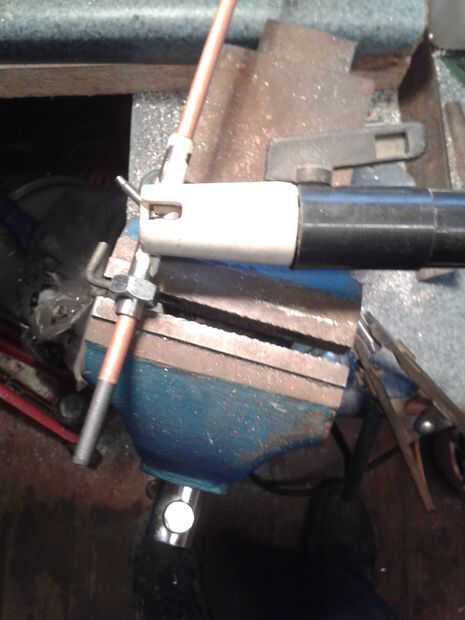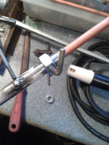 Hice un segundo tubo de soporte y pinza en el extremo de la botella de sorteo veo con autógena en un ángulo derecho mientras me burlaba hasta luego utiliza la barra de electrod de carbono solo en el aguijón y con varilla soldadura tig añadido algo extra de fuerza a la Unión como no quería que una muy hot rod caerse si cogí mientras trabajo.