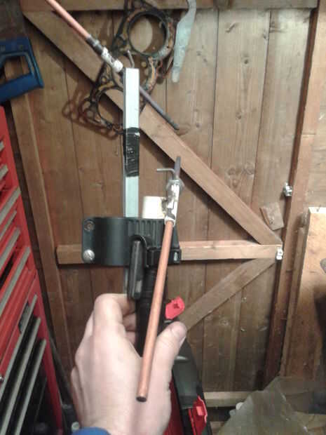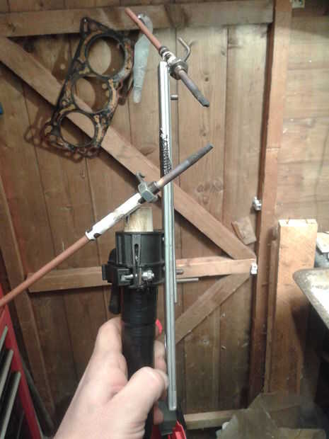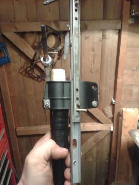 He utilizado un par de self tapping tornillos para sostener el regulador a la web de centro de la pinza de bloqueo y una tuerca M4 y otra pero de tablaroca para hacer un bloqueo de tornillo por lo que se pudo bloquear la corredera abierta y mantener las barras apartes por lo que pude poner la antorcha hacia abajo sin creando un arco accidentalmente.