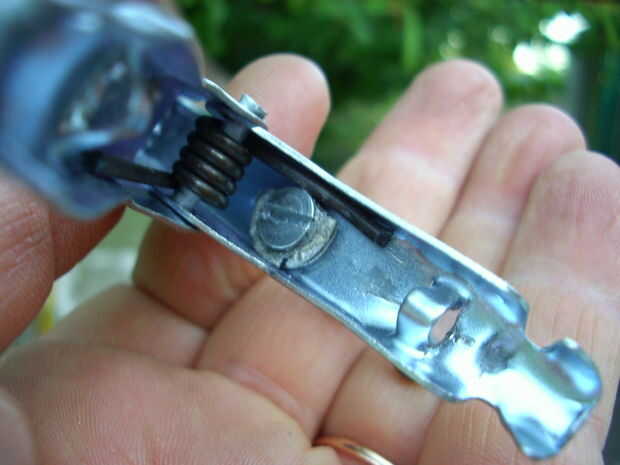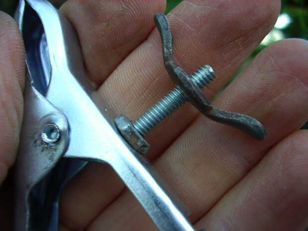 Hacer un agujero para la pinza de resorte para el tornillo, pasarlo y asegúrelo con la tuerca. La cabeza del tornillo debe ser dentro de un clip de resorte.