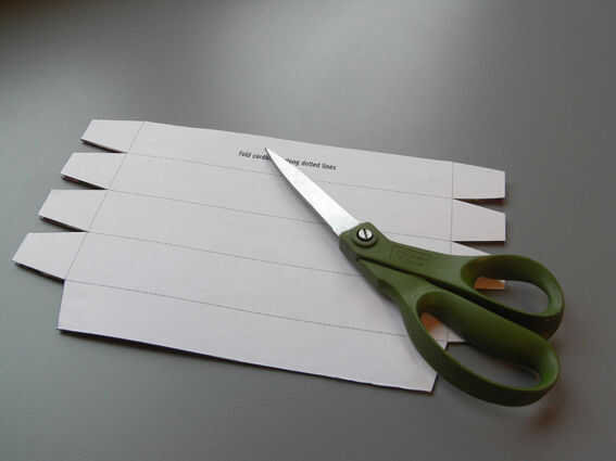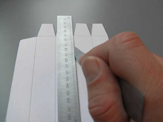 Usando una regla y una especie de punta de trazar una regla o parte posterior de un cuchillo de mesa, hacer una ranura en la tarjeta por la línea punteada.