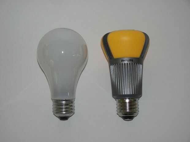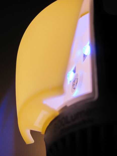 Lámparas AmbientLED tanto L premio son los bulbos de aspecto divertidos que naranja cuando no está energizado. Las lentes de plástico tienen fósforo en ellos que da la lente el color naranja. La bombilla utiliza LEDs azules detrás de la lente para que cuando la luz azul golpea el fósforo dentro de la plástica el fósforo ilumina de blanco. Esto al parecer tiene algunas ventajas de eficacia y con color de luz constante. 'Normal' white LED son también azul LED pero tienen el fósforo aplicado directamente a la matriz de LED (silicio) pero Philips separa de este bulbo. Apareció abierto uno de los lentes de plástico naranja y usted puede ver los LEDs azules están dentro.