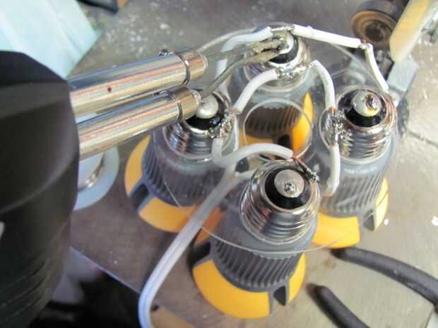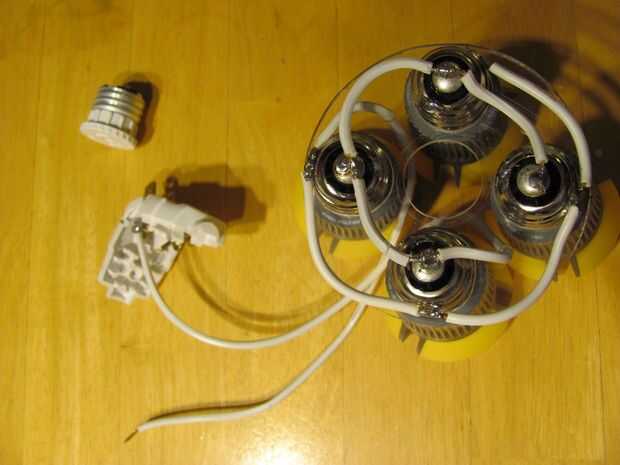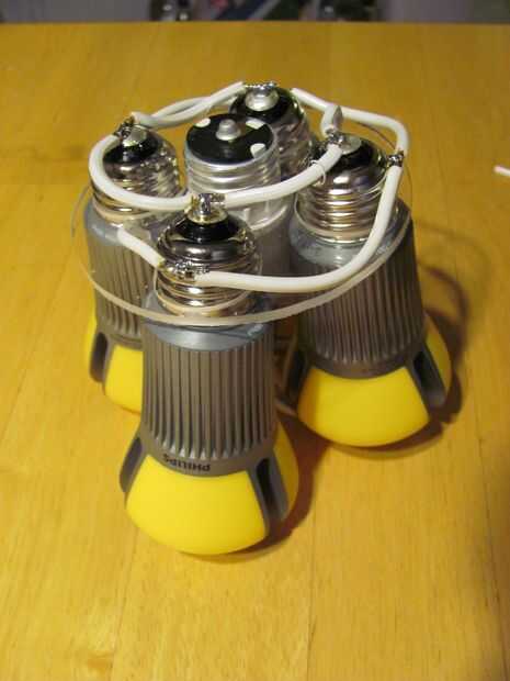 Cualquier parte de la base de tornillo de los bulbos que se ubicará por encima del marco de acrílico debe tener cinta aislante para evitar que nadie entre en contacto con lo. Los bulbos se inserta a través de los agujeros en el marco y orientados para que una de las lentes de 3 foco caras del centro para dar la mejor distribución de la luz. Uno de los extremos del cable eléctrico se divide parcialmente para proporcionar dos conductores separados y cada extremo pasado a través del agujero en el marco para llegar a los contactos de la base de bulbo.