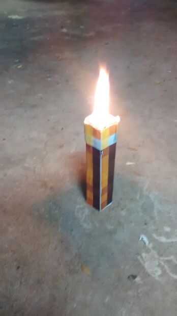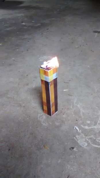 Ahora, sólo un encendedor y encender la antorcha! TEN MUCHO CUIDADO, EL FUEGO ES PELIGROSO. Ahora, usted puede disfrutar su antorcha de minecraft, aunque si planeas usarlo a menudo, recomiendo ignifugación todo esto de alguna manera. Sí, mía hizo luz en el fuego un poco (el papel), así que mucho cuidado y siempre tener agua cerca para apagar el fuego si es necesario.