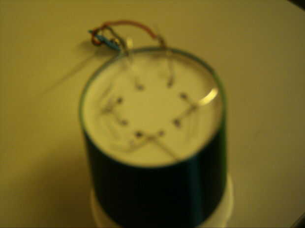Ahora que tienes tu taza listo, puede empezar a soldar. Empuje los LEDs a través de los orificios en la parte inferior de la taza, luego doblar los cables en la parte inferior para que se toquen, recuerde que el extremo más largo es el extremo positivo, que debe estar tocando el extremo negativo del otro LED. Conectar utilizando soldadura y no se olvide el resistor y el cierre de la batería.