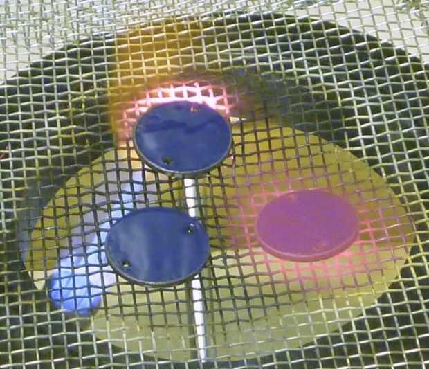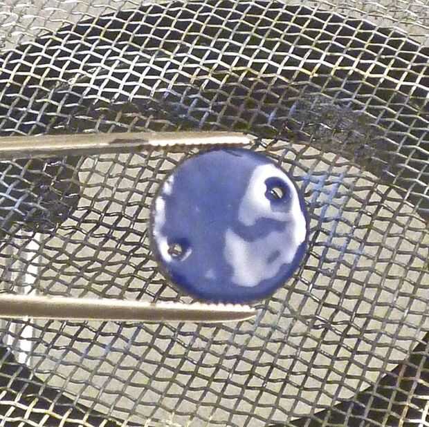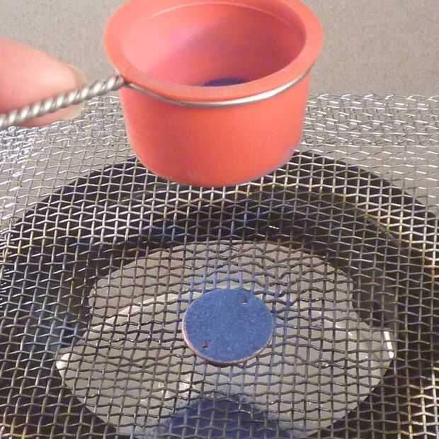 Después centavos han sido incendiados, dejan enfriar en la malla de 3 a 5 minutos. Dependiendo del color y grosor del esmalte, se puede ver el centavo bajo el vidrio. Si te gusta ese look, cuidadosamente Quite las monedas de la plataforma, uso de pinzas y colocar sobre la almohadilla ignífuga (como Solderite). Asegúrese de agarrar la moneda solamente por su borde y no la cara esmaltada de ahora. Colocar otra moneda en la plataforma de acoplamiento, polvo como antes y antorcha.
