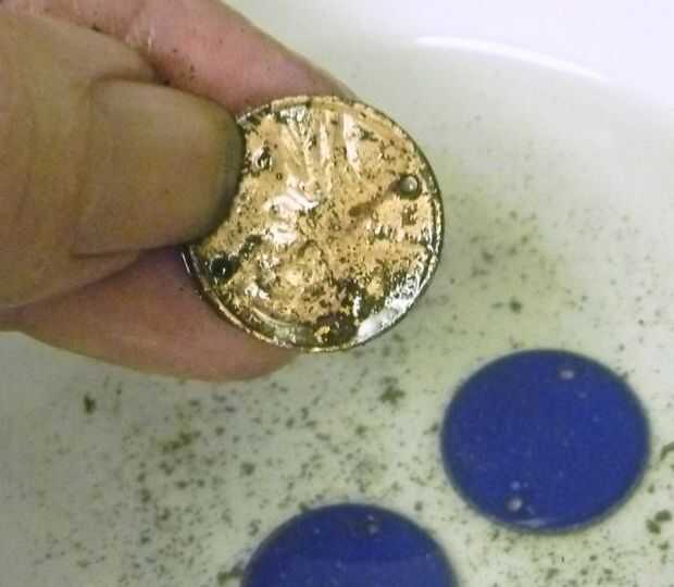 Una vez fresco, pop las monedas nuevamente dentro de la sal vinagre solución de 3 a 5 minutos a fuego desincrustar. No duele el esmalte si las monedas quedan en la solución de más larga que el sugerido. Después del remojo, quitar con pinzas de cobre o bambú.