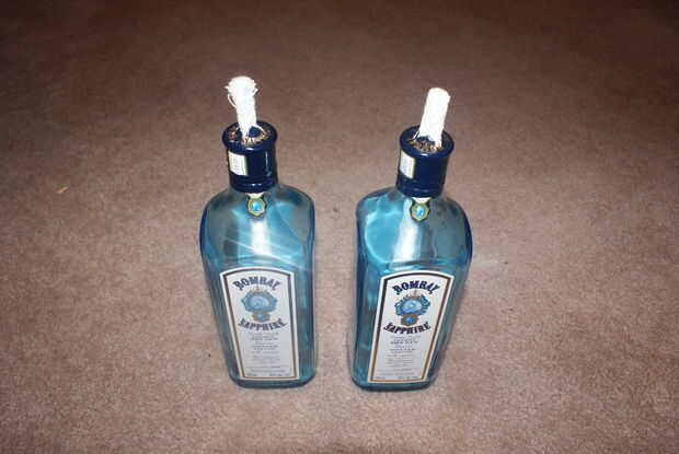 Necesario para reemplazar viejas antorchas de tiki oxidados y así fui a eBay y consiguió algunos hermoso azul cobalto 750 ml botellas de vino. Compré 12 37.50. En Amazon, tengo mechas con tapones de cerámica (2 / $6,72). Estas bien quemaron y la bote