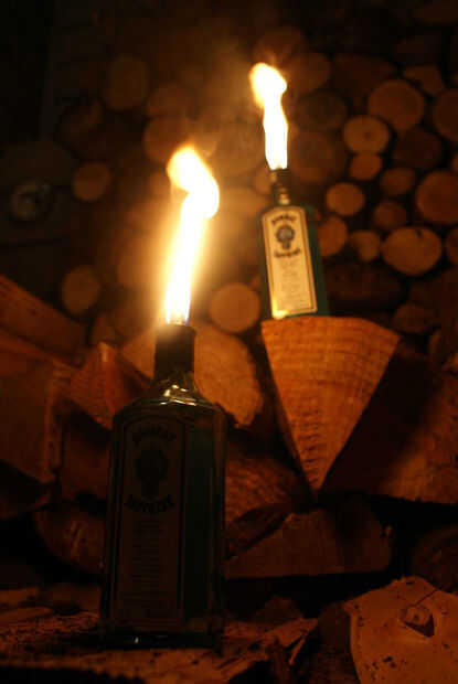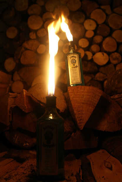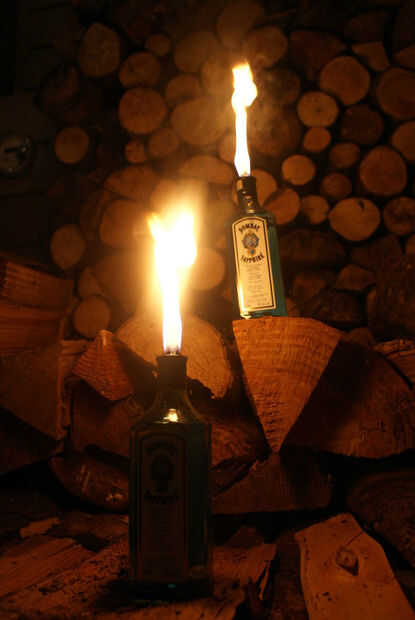 Necesita su botella de cerveza favorita u otra botella, mecha de antorcha tiki, guita del yute, combustible de tiki, una caña de bambú y un encendedor. También puede utilizar como una linterna de mesa y omitir la guita de poste y yute de bambú.