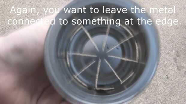una vez aparición cortan los rayos radiales, tienes que terminar tu; aspas del ventilador haciendo un corte a lo largo del borde exterior de la can. Este corte debe ser consistente para cada lámina, puede optar por hacer la puede girar en cualquier dirección por corte ya sea en sentido horario o antihorario, pero todas las hojas deben cortarse la misma dirección por lo que se enfrentan a la misma manera cuando estén terminados. sólo desea cortar aproximadamente 2/3 de la forma de la siguiente habló de manera que la lata permanece conectada a las aspas del ventilador.