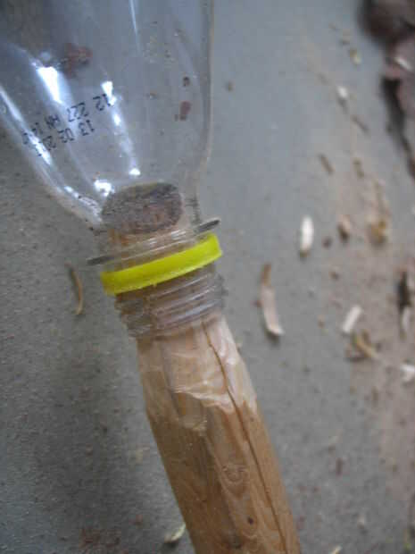 Tallar lejos en su palo largo, espiga, pimpollo o rama de árbol delgada para que la botella de plástico se ajusta firmemente en un extremo.