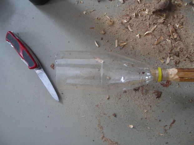 Corte la botella de plástico en donde alcanzaría el cuello de la botella de cristal (si se va a introducir la botella de vidrio de la botella de plástico).