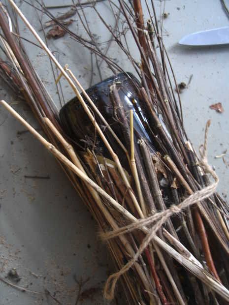 Corbata ahora sus largos carrizos hierbas alrededor de la botella de vidrio para que el extremo largo se está pegando por encima del orificio de la botella/para que las cañas de hierba terminan cerca de la base de la botella.