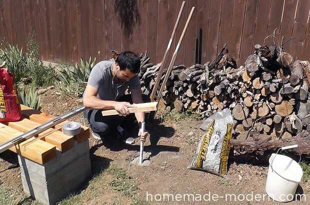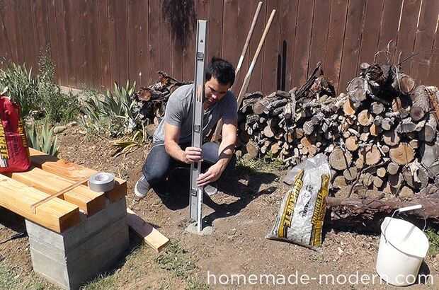 Usé la tubería de PVC como un socket para recibir el tubo de cobre. Normalmente utilizaría un casquillo de PVC, pero recuerdo conseguir uno usé cinta adhesiva para cerrar un extremo de la tubería de PVC. He golpeado el tubo en su lugar y utiliza un nivel para ajustarlo hasta que ya era perfectamente vertical.