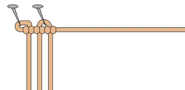 Poner un pin en la placa, la otra mitad de la cadena alrededor del lazo, luego atar un doble enganche de media con ese lado. Tenga cuidado de no dejar un bucle donde el pin es o a tener un lazo en el borde de la pieza acabada.