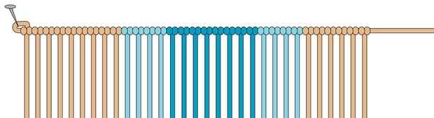Repita este proceso con todas las hebras restantes. Para duplicar mi pieza vas a necesitar 5 tan, 2 azul claro, azul medio 4, 2 luz tan azul y 3.