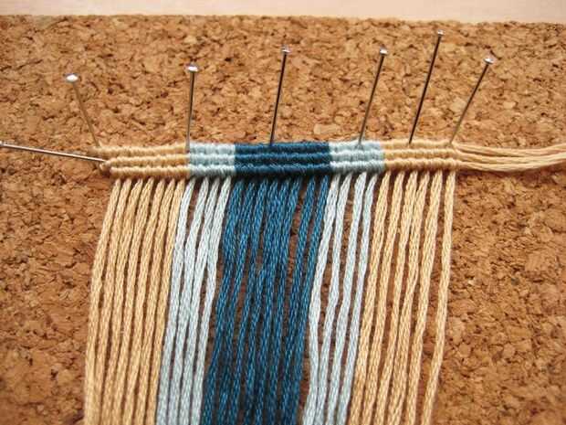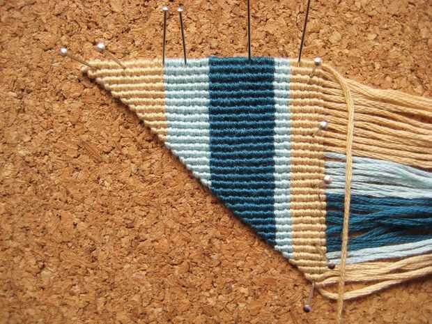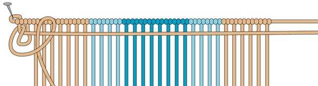 Seguir trabajando de esta manera - más a la izquierda strand atraviese, nudo sobre ella - hasta que lo hayas hecho con todas las hebras (la última de ellas sólo quedará colgando verticalmente.)