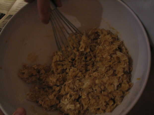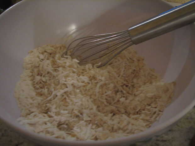 - Ahora, en un bol grande combinar avena, harina, azúcar y coco.
