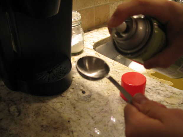 Consejo: En la tercera imagen abajo estoy fumigando la cuchara de medición con aerosol para que el jarabe de oro no se peguen a él.