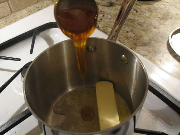 - En una cacerola mediana combine mantequilla y jarabe de oro o miel; Revuelva sobre fuego suave hasta que se derritan.