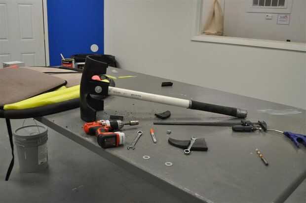 Luego perforé un agujero a través de goma y un agujero correspondiente en el centro del mango (centro no del todo, ya que son difíciles de perforar los cilindros y atado con un perno bastante decente y arandelas.