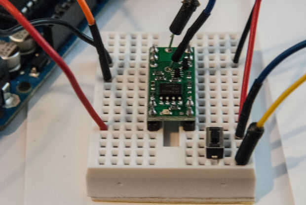 La foto muestra el interruptor de contacto momentáneo montado en la protoboard y la línea OFF de Arduino
