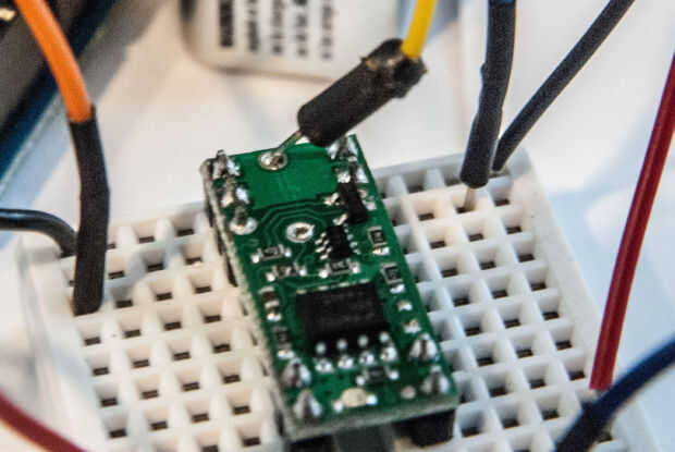 En lugar de cableado el contacto momentáneo del interruptor en los 2 puntos marcados en el PCB, en lugar de otro cable de un lado de su contacto momentáneo interruptor en el conector más cercano a la final de la Junta y el otro a GND. Esto permitirá que el interruptor de contacto momentáneo encender el poder, pero no apagado otra vez. Para apagar la unidad, quite el poder, o tiene el Arduino lo pare usando el conector de OFF.