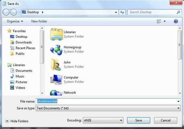 Guardar en cualquier lugar que desee como parada (o lo que sea por consiguiente) .bat, por lo que sería "shutdown.bat" por ejemplo.