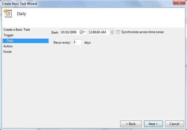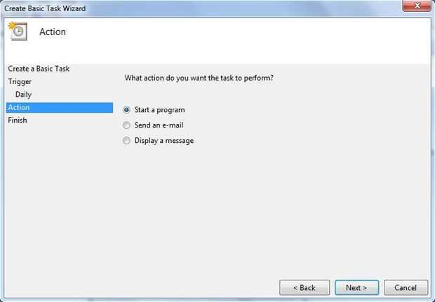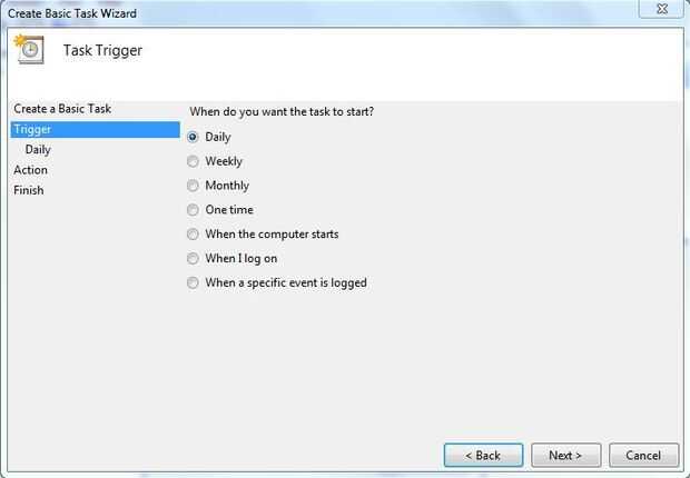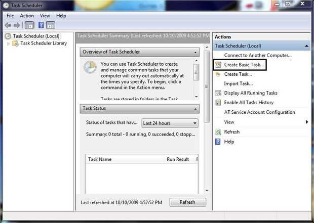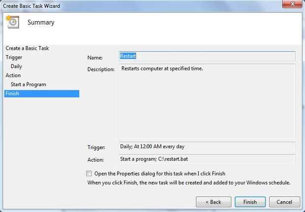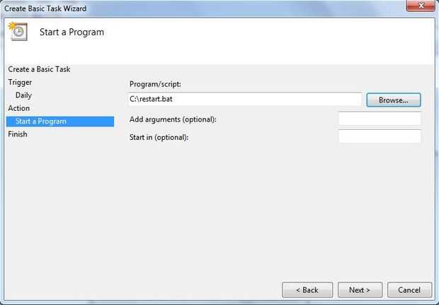 En Windows Vista o 7 búsqueda de "tarea"; Programador de tareas debe estar en la parte superior de la lista. Para abrirlo. Haga clic en "crear tarea básica". Escriba el nombre que desea llamar y una descripción si lo desea. Especificar cuando quieras empezar. Especificar fecha, hora y repetición. Seleccione una acción (iniciar un programa). Busque el archivo por lotes. Al final, vista para asegurarse de que es exactamente lo que desea y haga clic en finalizar. En el menú principal de administrador de tarea, tienes que actualizar la lista en la parte inferior para el nuevo archivo por lotes aparecer (esto es opcional, se llevará a afectar de cualquier manera). Es mejor para el equipo reiniciar para tener efecto.