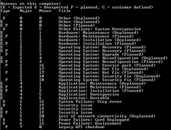 Cierre de tipo cmd y le dará una lista de estas variables. En cuenta que no todos los sistemas operativos le dará una lista completa, algunos no pueden dar todos los números de identificación de razón, algunos pueden no tener todas las variables o no apoyarlos, algunos incluso simplemente pueden cerrar sin importar de qué forma el comando de apagado se pone en la línea de comandos.