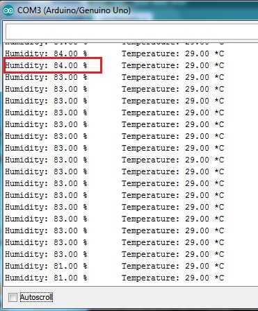 Abrir monitor de terminal y observe el valor de % de humedad durante un minuto. Anote el valor máximo que tienes. Será el umbral para nuestro próximo programa. He encontrado máximo 84 en mi habitación que está marcado como cuadro rojo en la imagen.