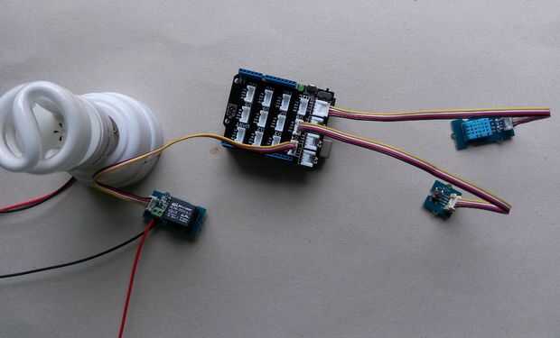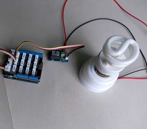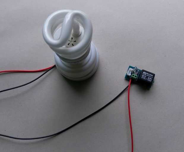 Conecte una lámpara CFL para el relé de que conexión anterior al escudo base. Tienes que conectar dos cables, uno del relé y otro de la lámpara a la fuente. ¡Ten cuidado! Existe un riesgo de descarga eléctrica. Hacerlo en su propio riesgo.
