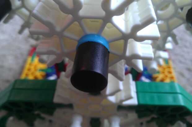 Unir la caja a la base mediante la inserción de la barra de centro azul en el caso a través del orificio central en la pieza de cuello. A continuación, agregue un separador azul y una gorra negra.