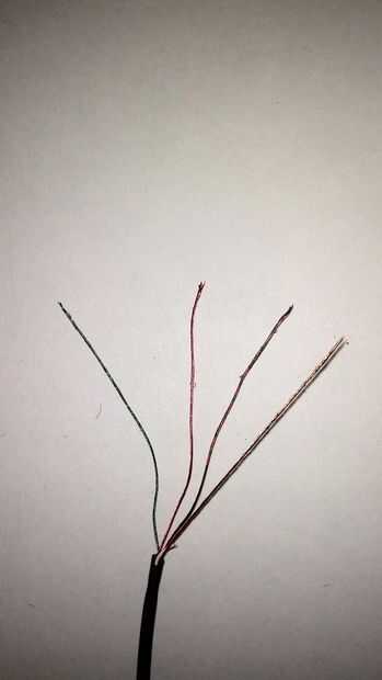 Habrá tres o cuatro alambres trenzados dentro de la caja; dos cables de color sólido, en mi caso rojo y verde y un cable de tierra. Estos son los cables sólo que nos importan. No dude en cortar lejos cualquier otro cable.