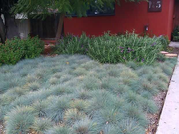 Las nuevas plantas pueden variar ampliamente en precio, pero es mucho más barato que el césped. He plantado sabios, salvias, Romero, patas de canguro, Festuca azul y otras especies que requieren poco o ningún riego. El remiendo de la hierba que se ve en algunas de las fotos es un pasto que compré en un almacén de hierba artificial. Mi esposa quería un lugar para sentarse en la parte delantera