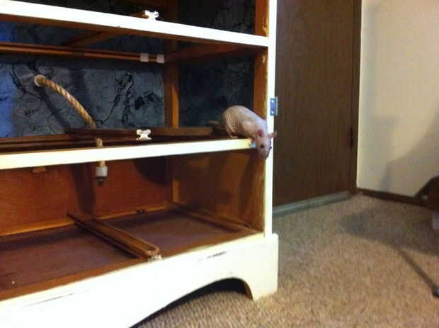 Oh, y me encontré con cuerda para jaulas de pájaros y sujetado en la parte trasera de la cómoda. Un poco algo para las ratas a subir.