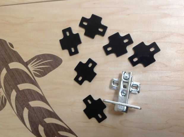 -Mis tiendas de mejoras para el hogar local no llevó las bisagras de recubrimiento medio, así que corte hacia fuera algunas cuñas de plástico de la impresora láser. Esto me permitió usar recubrimiento lleno las bisagras en su lugar.