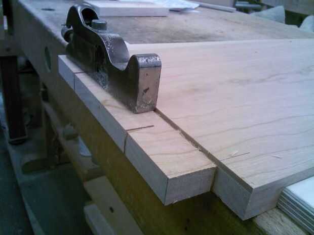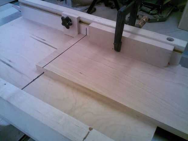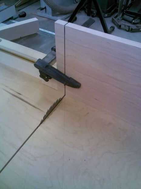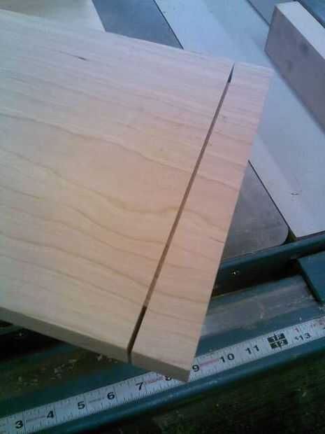 Después de diseño las espigas, hacer una 1/8" corte profundo 1 ¼" desde el extremo en todos los tableros de tres. Usar una cruz cortada trineo con un bloque de tope.
