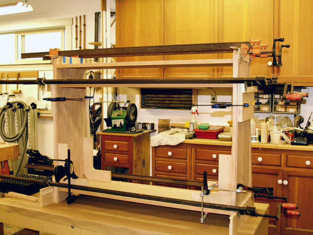 El gabinete utiliza a través de morise y espiga carpintería para sujetar los separadores horizontales y laterales.