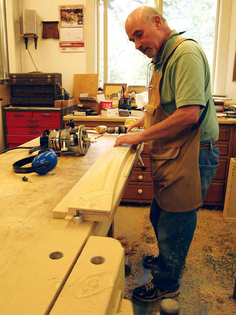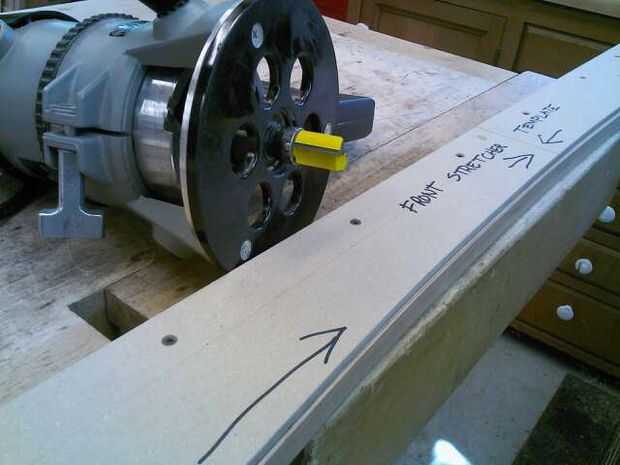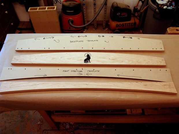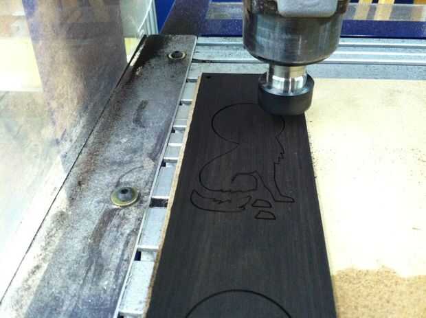 Proporciona el fabricante CNC un archivo JPEG de la obra y generaban la incrustación con ébano y arce que suministra. También generaron las piezas laterales. Cortan a través de los mortajas, el ciego-mortajas y mortajas en el interior la cara y las formas curvas de la parte superior e inferior.