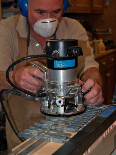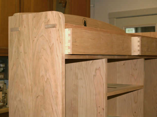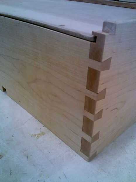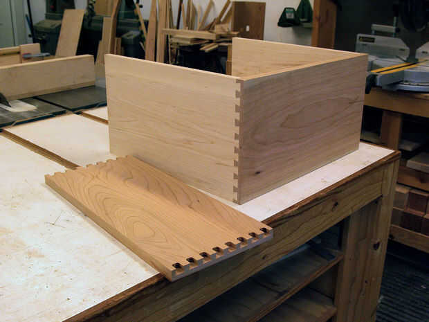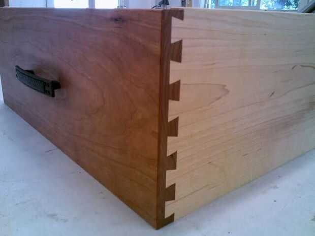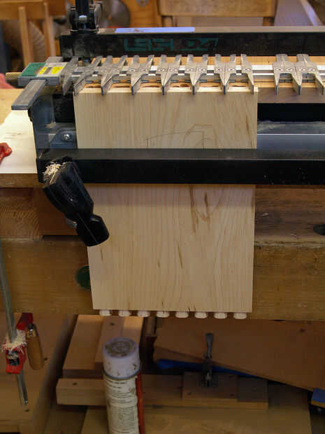 Usé una plantilla de cola de Milano de Leigh para hacer los cajones. La parte frontal de los cajones están hechos con medias colas de Milano ciegas. La parte trasera de los cajones se hacen con a través de colas de Milano.